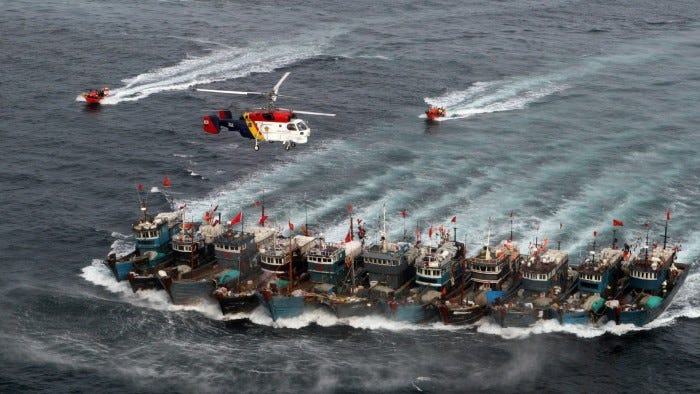 This by no means a new development. Illegal, unregulated and unreported fishing (IUU) has been going on for decades, but it’s become especially acute since 2016. The Chinese fleet has ravaged their own waters and are now raiding fisheries the world over, from Peru to the Philippines to West and East Africa.