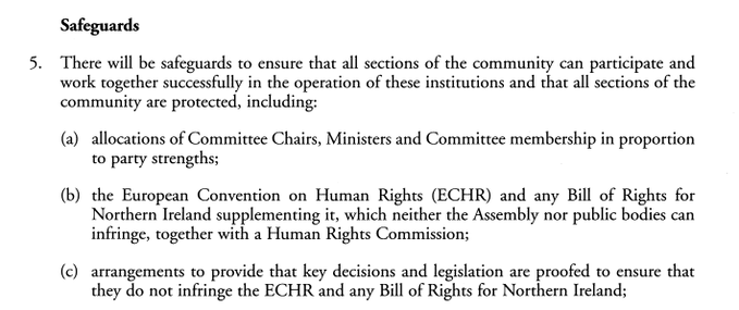 His report doesn't go much deeper than this. It fits with the propensity on the right to gloss over that which is inconvenient. This seems like sophistry to me. The actual text of the GFA below says "There will be safeguards to ensure that all sections of the community can participate and work together successfully in the operation of these institutions".